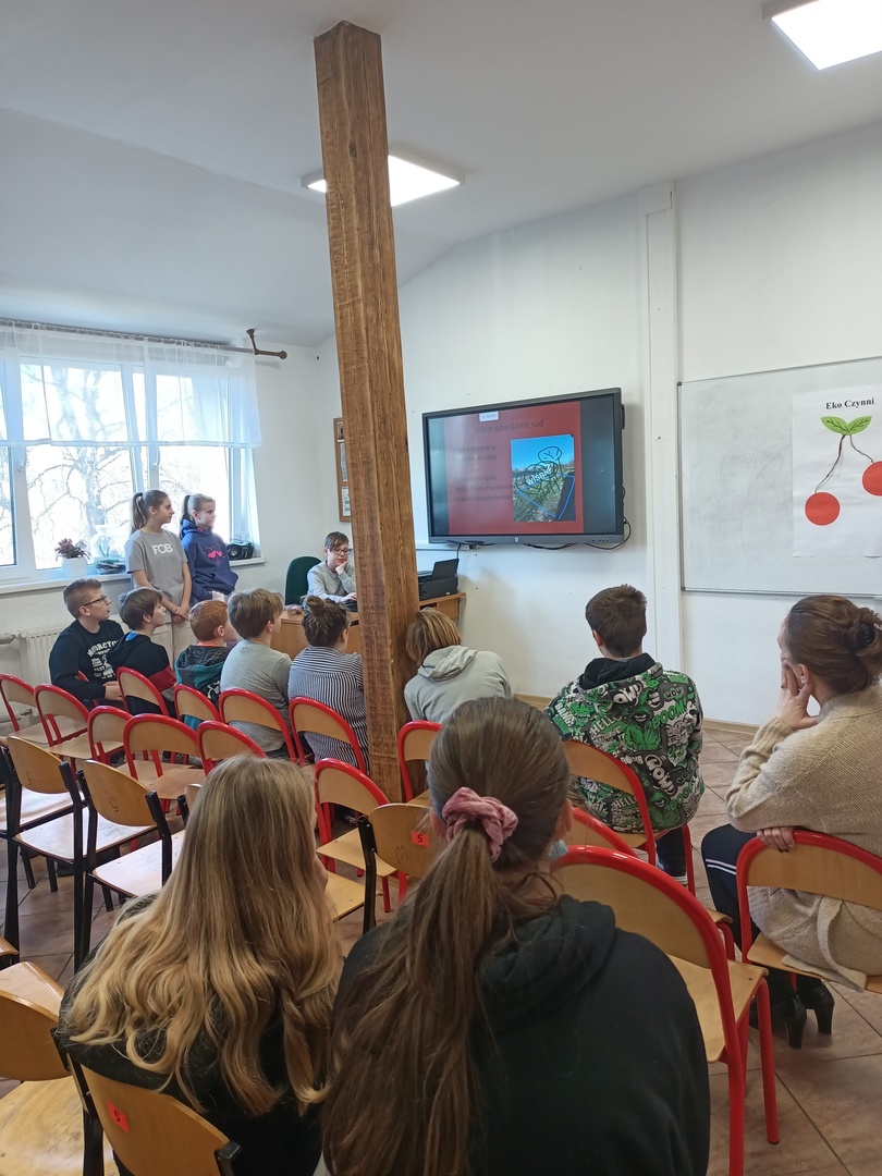 Szefami projektu w naszej szkole jest grupa Eko Czynni na czele z Adamem, Hanią i Marysią uczniami klasy VI. Ich pracę koordynuje Pani Basia- nasza szkolna przyrodniczka. Do tej pory udało nam się pozyskać niezbędną wiedzę, uczestniczyliśmy w zajęciach edukacyjnych. Poszukiwaliśmy sadowników w naszym terenie. Zwieńczeniem pracy była szkolna konferencja na której podzieliliśmy się z kolegami i koleżankami naszymi działaniami oraz celami realizowanego projektu.