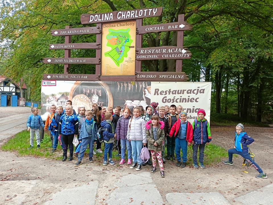 Dnia 30.09.2022r uczniowie klasy I Szkoły Podstawowej w Pieszczu wspólnie z uczniami wszystkich klas I z terenu naszej gminy, na zaproszenie Wójta Gminy Postomino Pana Janusza Bojkowskiego udali się na jesienną wycieczkę do okolicznej Doliny Charlotty.