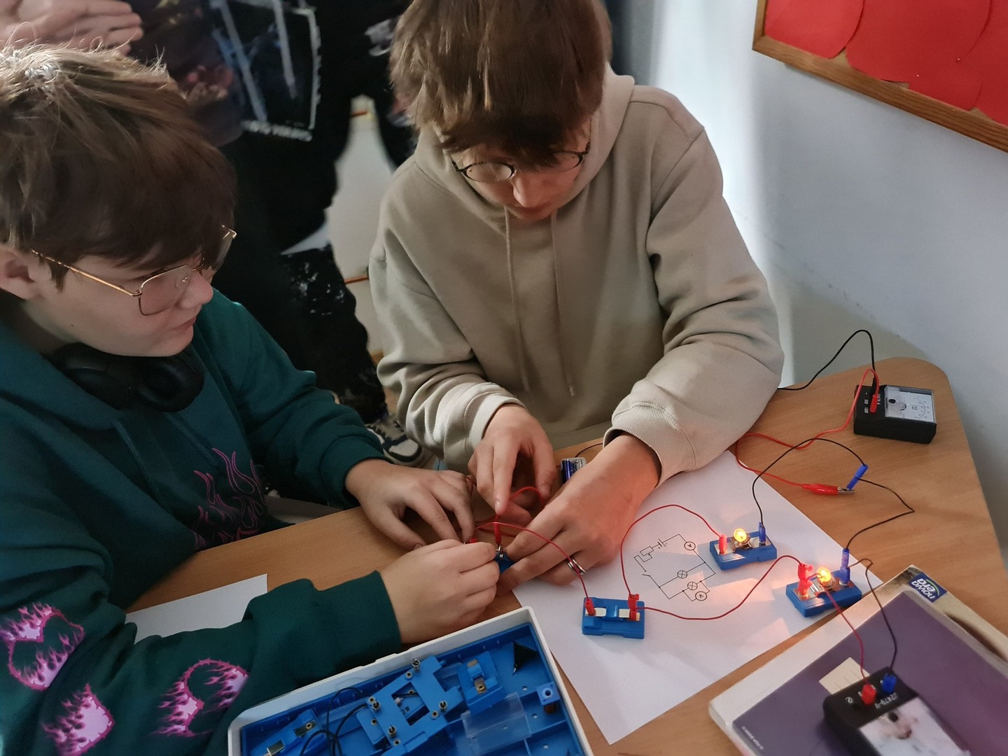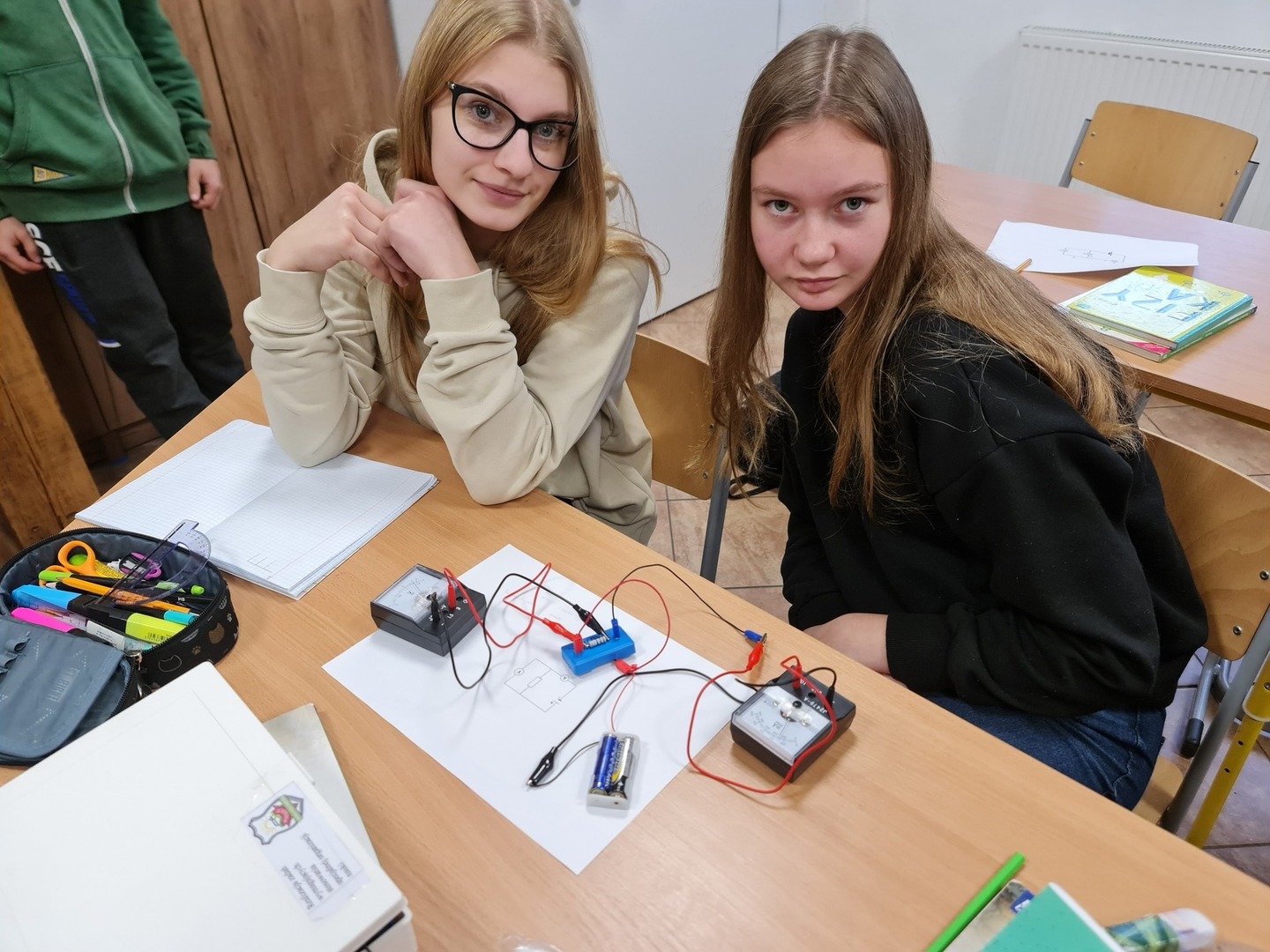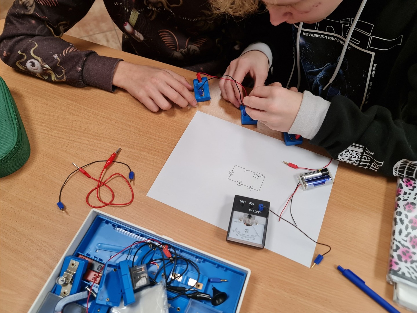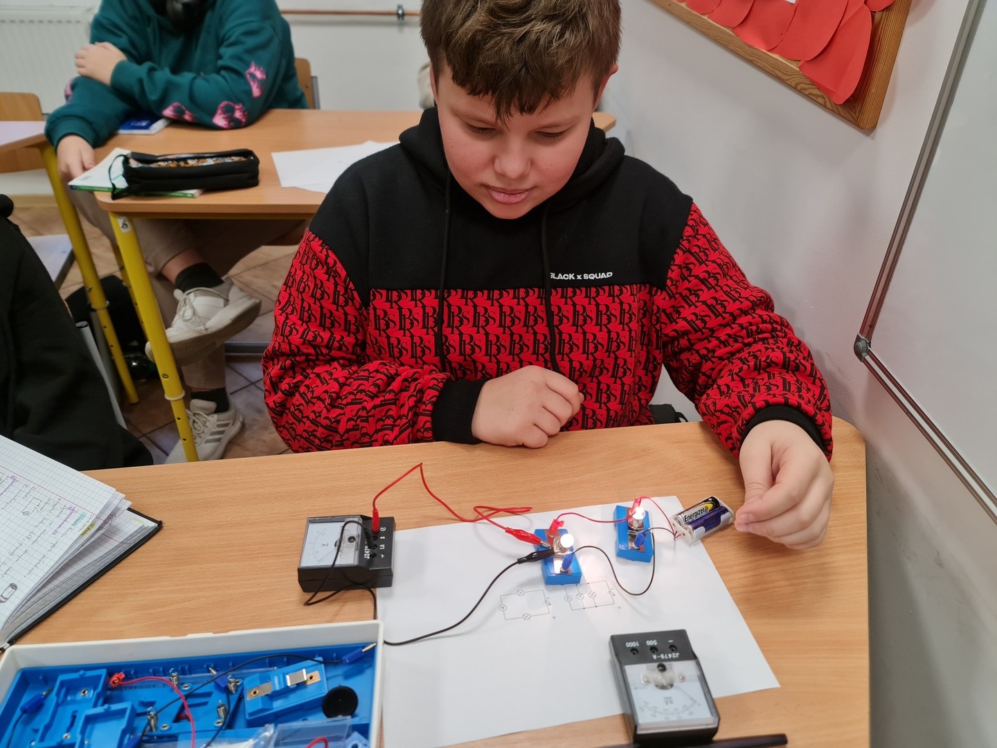 Na lekcji fizyki uczniowie klasy 8 poznawali tajniki obwodu elektrycznego. Po zapoznaniu się podstawowymi zasadami bezpieczeństwa w podłączaniu urządzeń elektrycznych przeszli do praktyki. Wykonano kilkanaście kart pracy z narysowanymi obwodami elektrycznym. Dzięki możliwości zakupienia z programu „LABORATOIA PRZYSZŁOŚCI” każdy uczeń mógł samodzielnie podłączyć swój obwód elektryczny. Jak widać na zdjęciach uczynią bardzo się podobało.