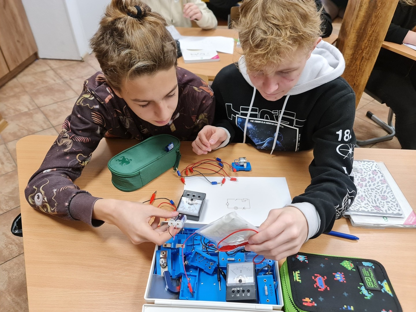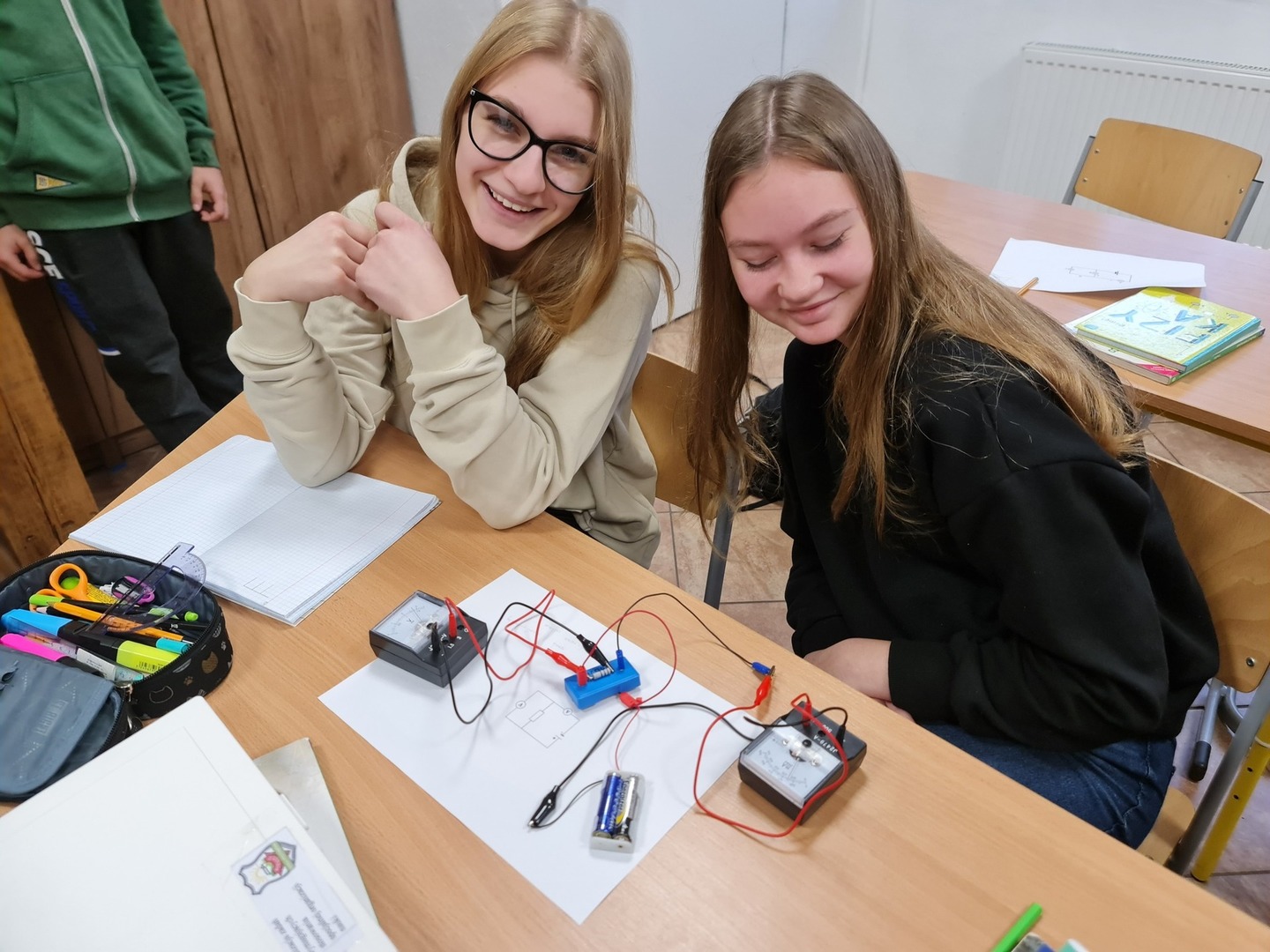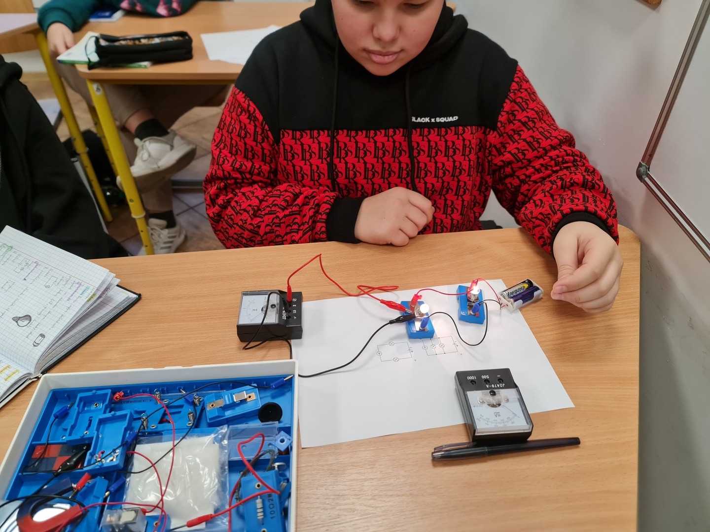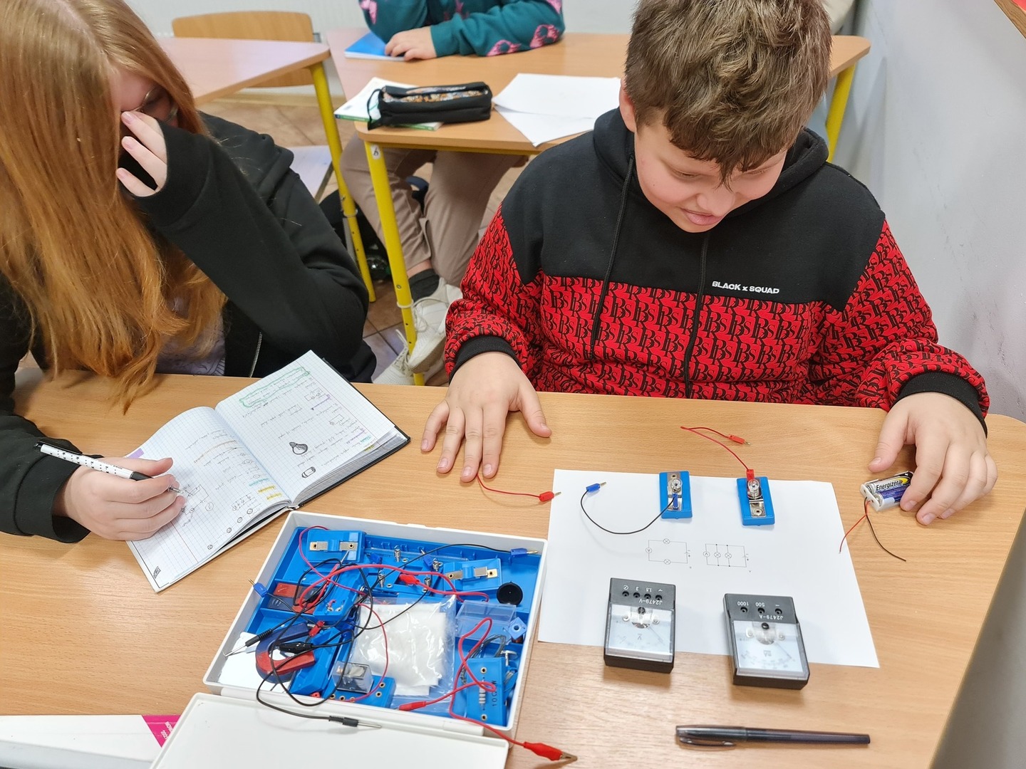 Na lekcji fizyki uczniowie klasy 8 poznawali tajniki obwodu elektrycznego. Po zapoznaniu się podstawowymi zasadami bezpieczeństwa w podłączaniu urządzeń elektrycznych przeszli do praktyki. Wykonano kilkanaście kart pracy z narysowanymi obwodami elektrycznym. Dzięki możliwości zakupienia z programu „LABORATOIA PRZYSZŁOŚCI” każdy uczeń mógł samodzielnie podłączyć swój obwód elektryczny. Jak widać na zdjęciach uczynią bardzo się podobało.