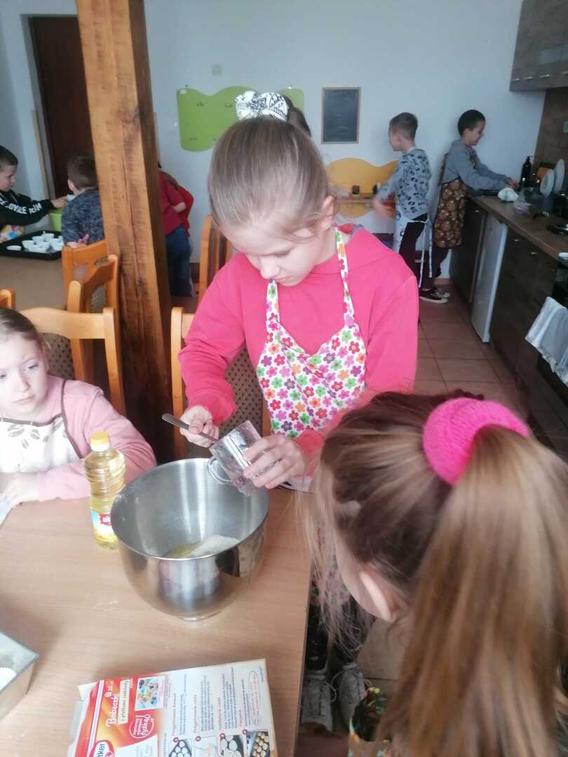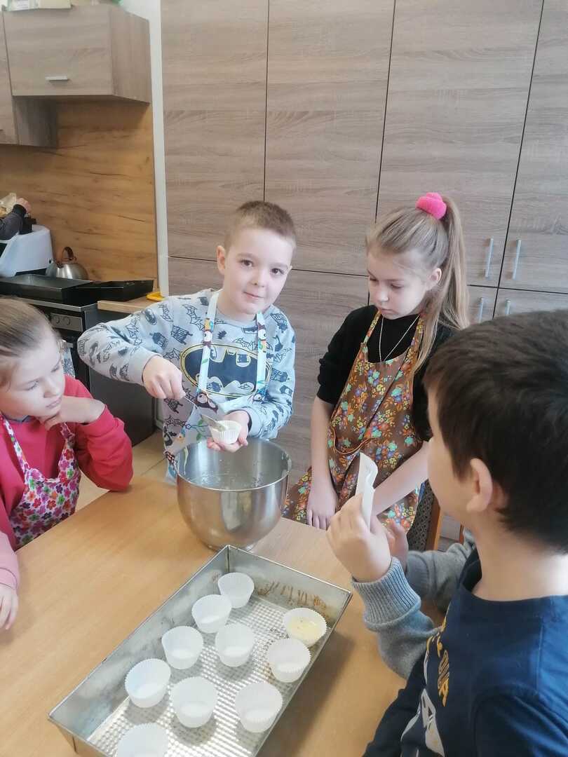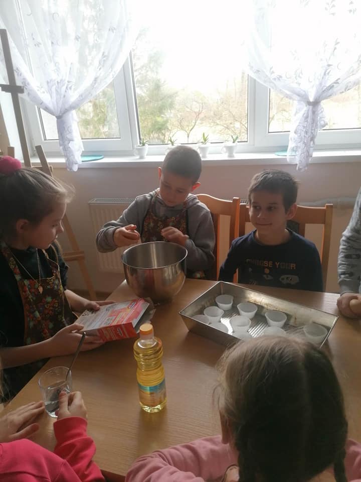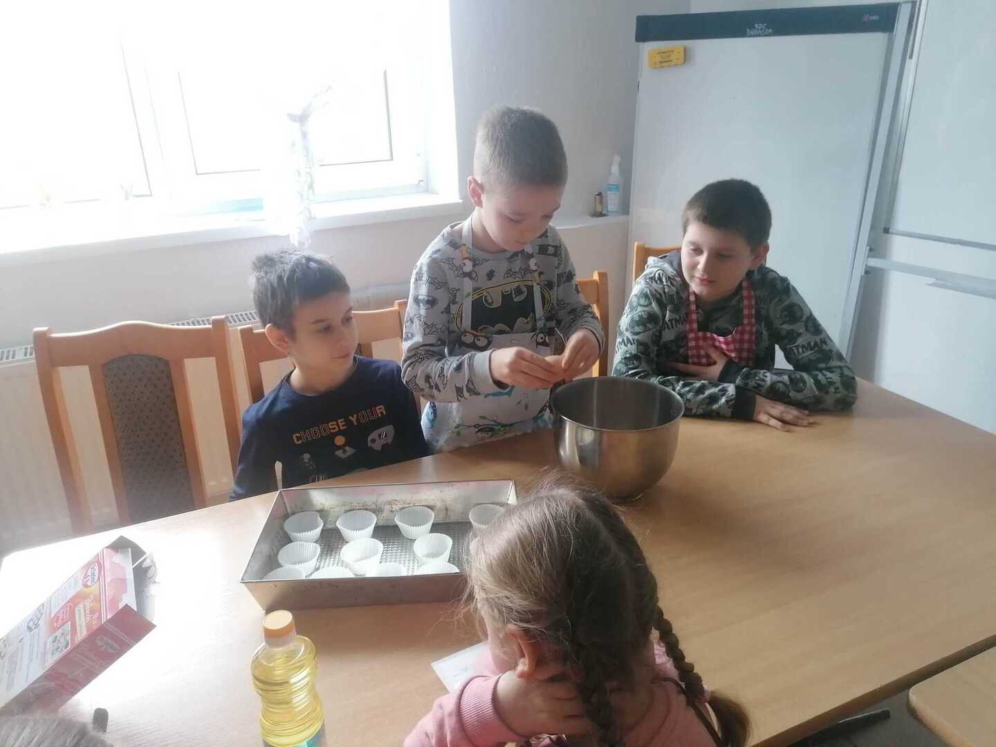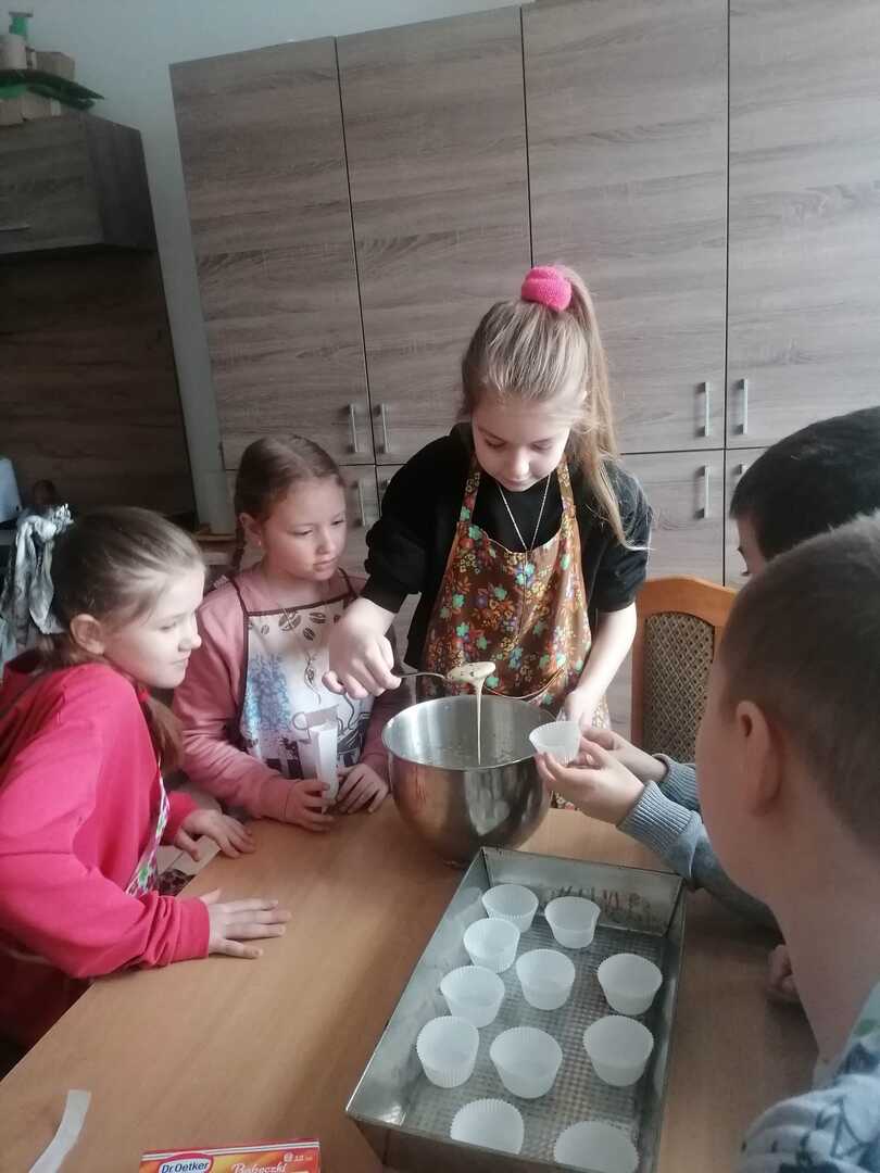 Uczniowie klas młodszych na zajęciach kreatywno-rozwijajacych kultywowali tradycje związane ze Świętami Wielkanocnymi. Dzieci wykonały babeczki z posypką czekoladową. 🥯🍪🍩