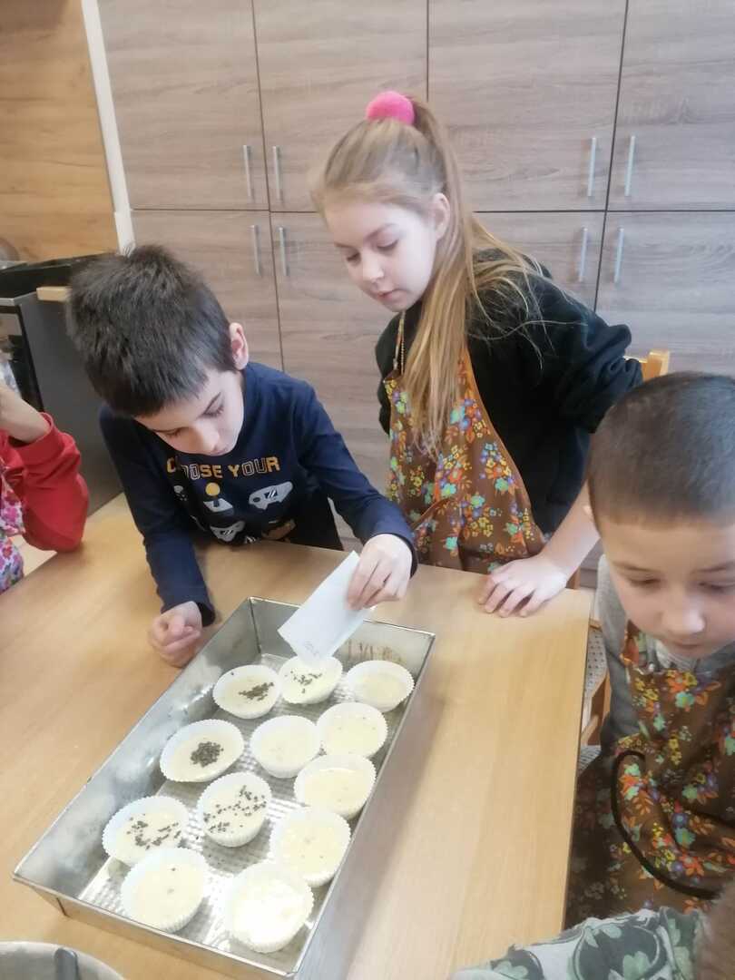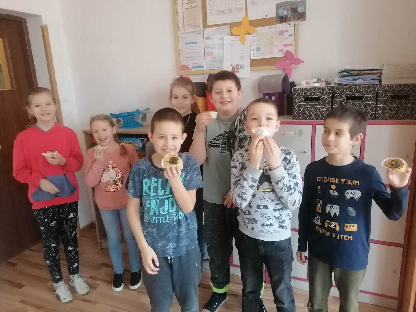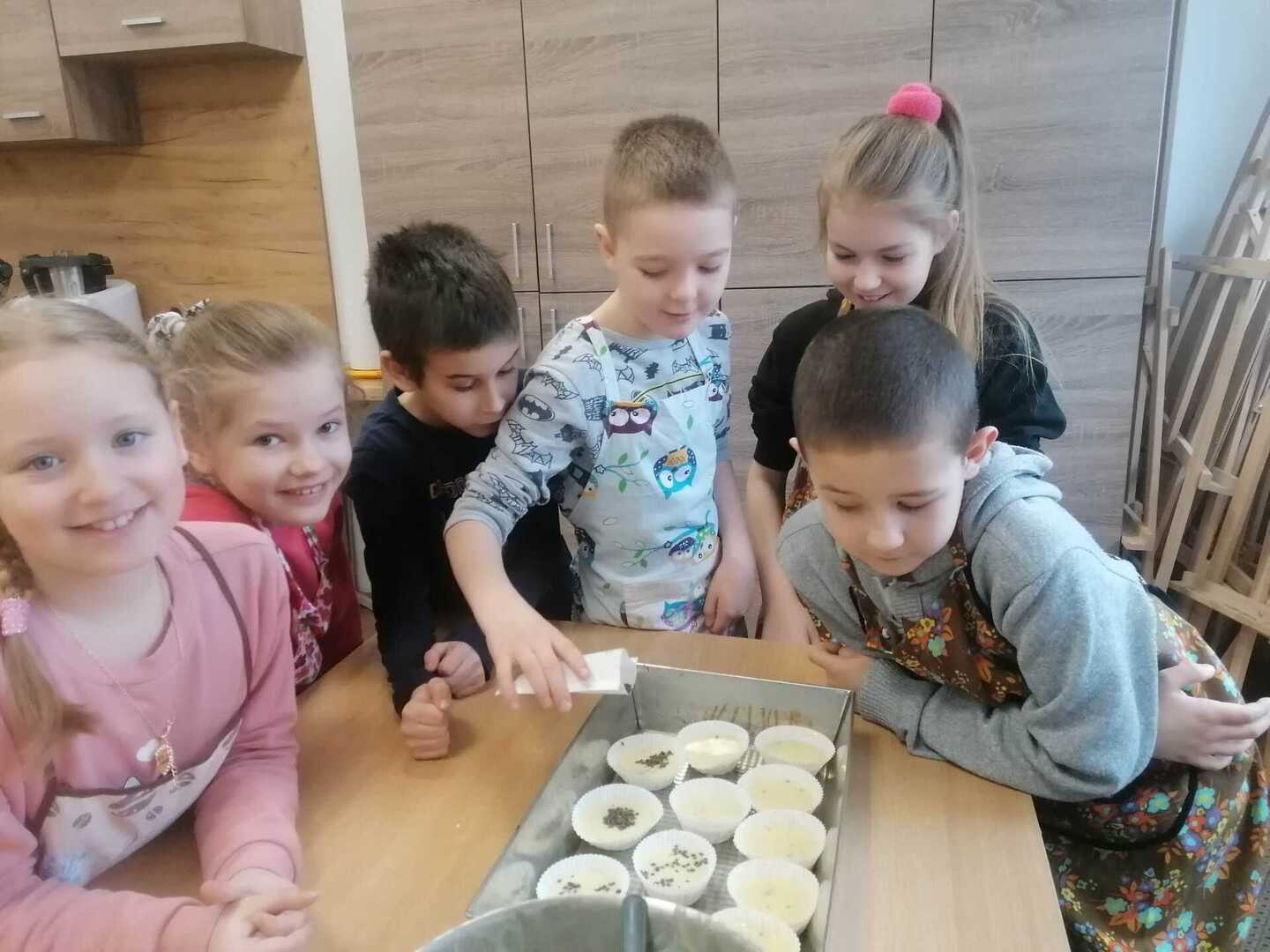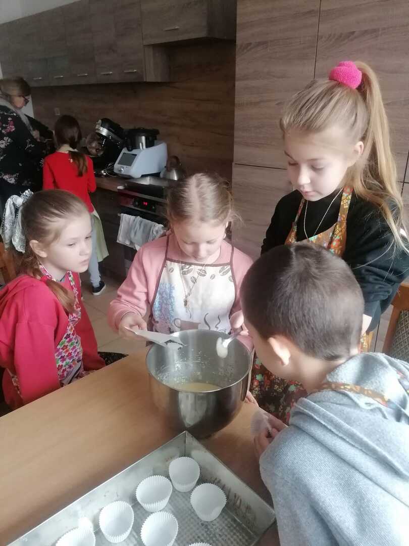 Uczniowie klas młodszych na zajęciach kreatywno-rozwijajacych kultywowali tradycje związane ze Świętami Wielkanocnymi. Dzieci wykonały babeczki z posypką czekoladową. 🥯🍪🍩