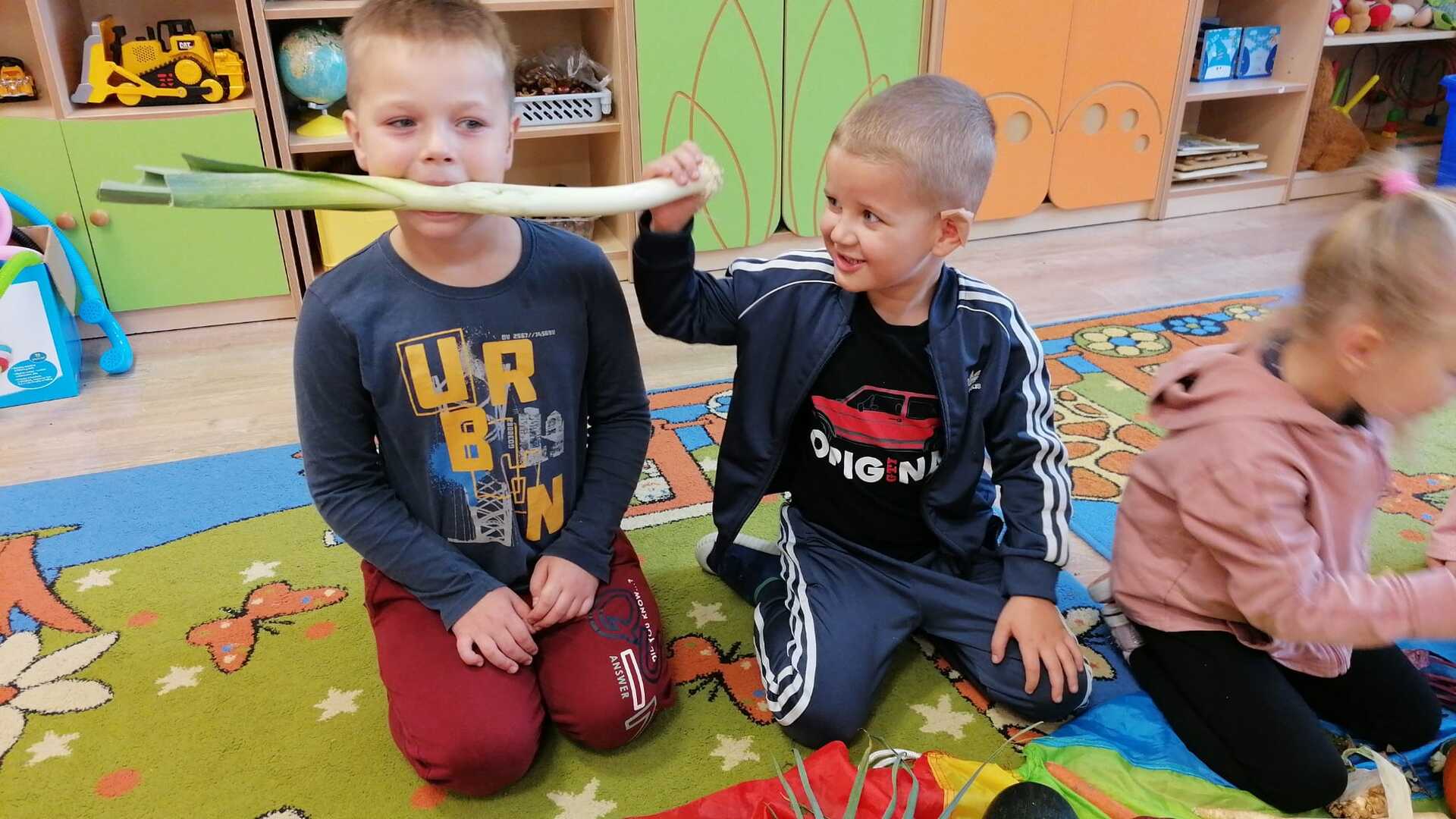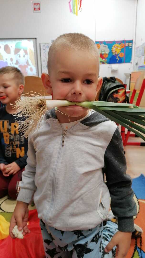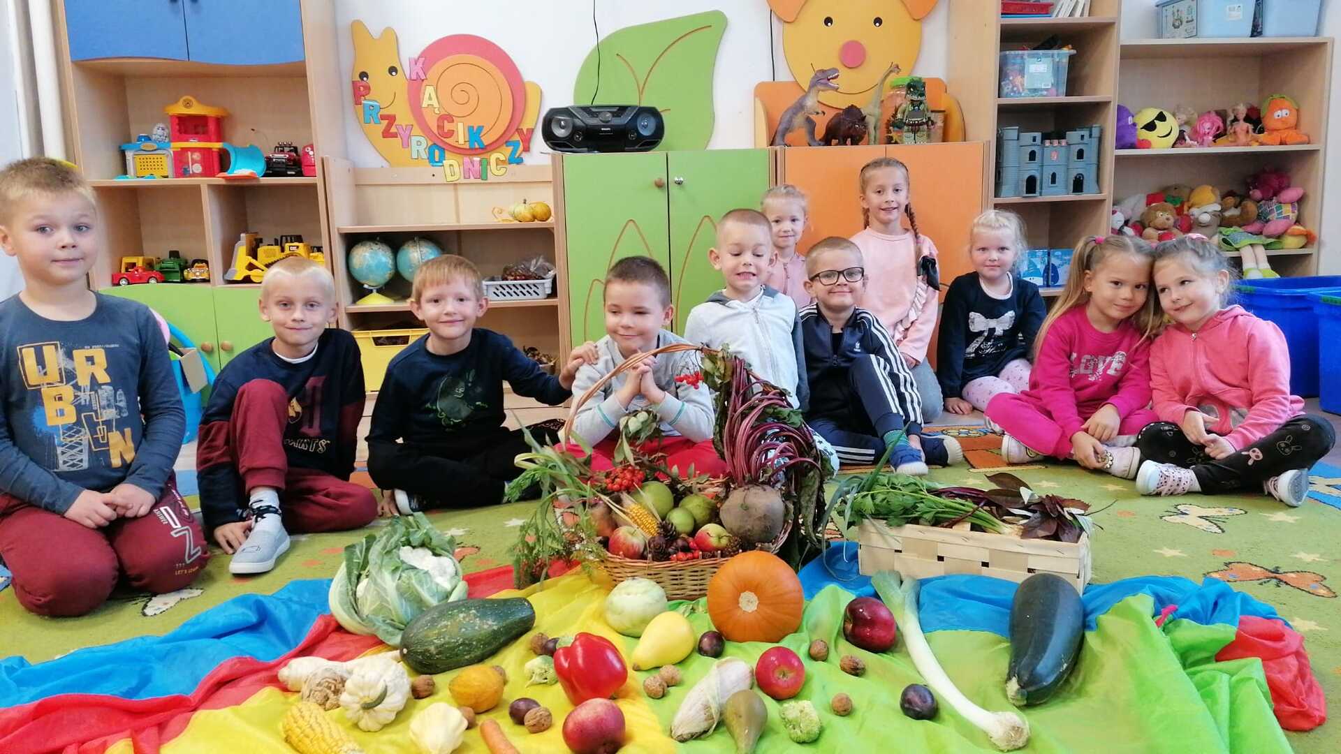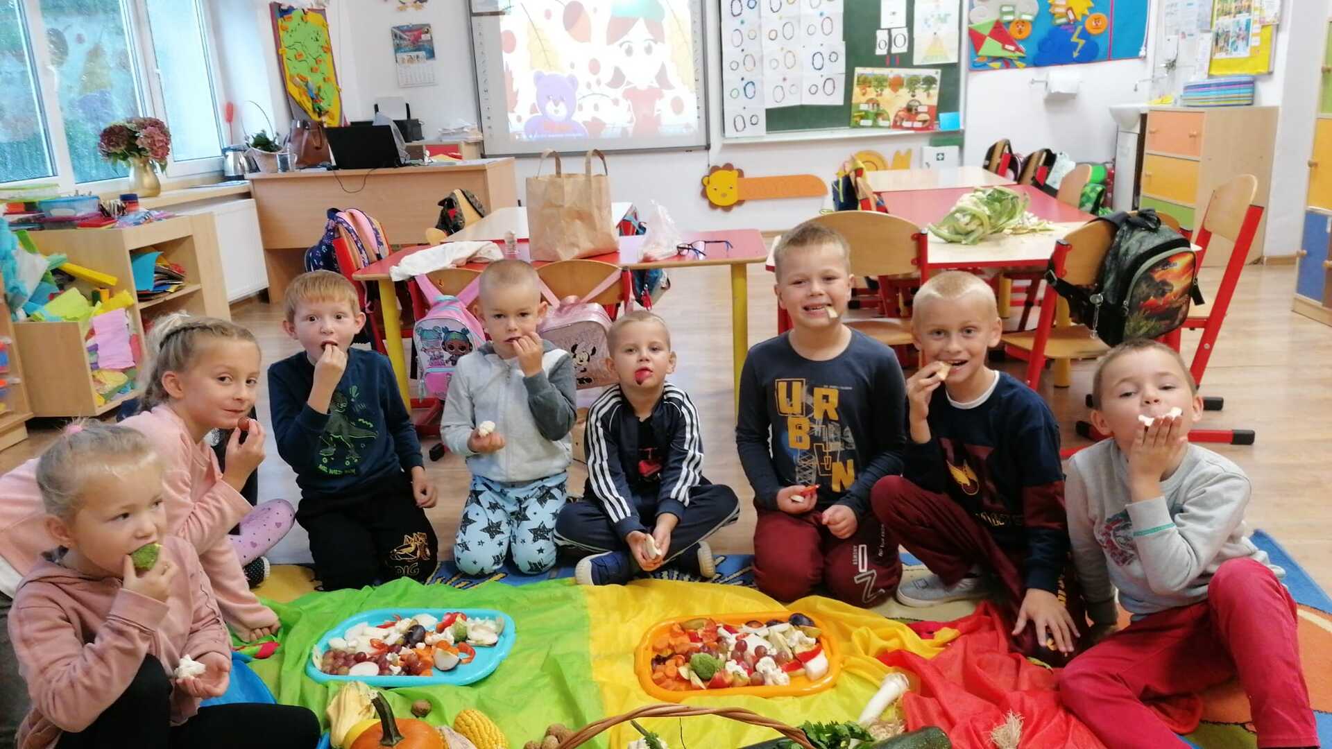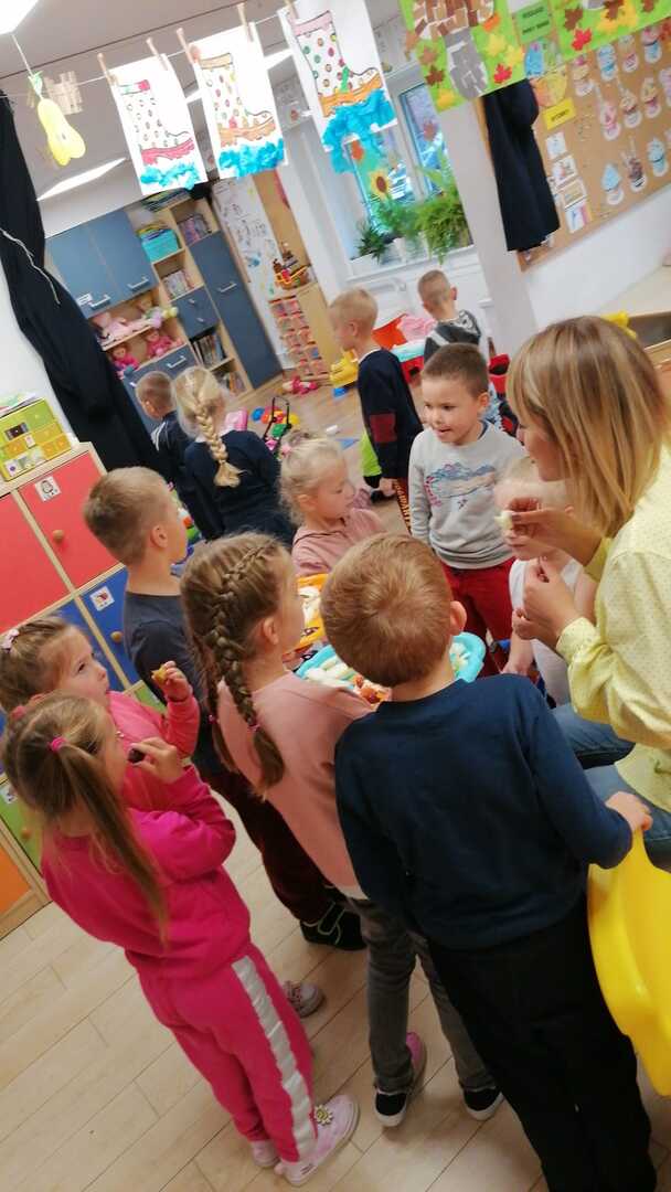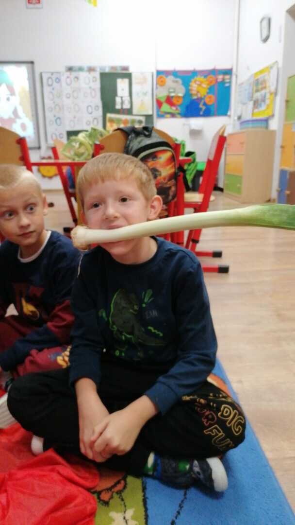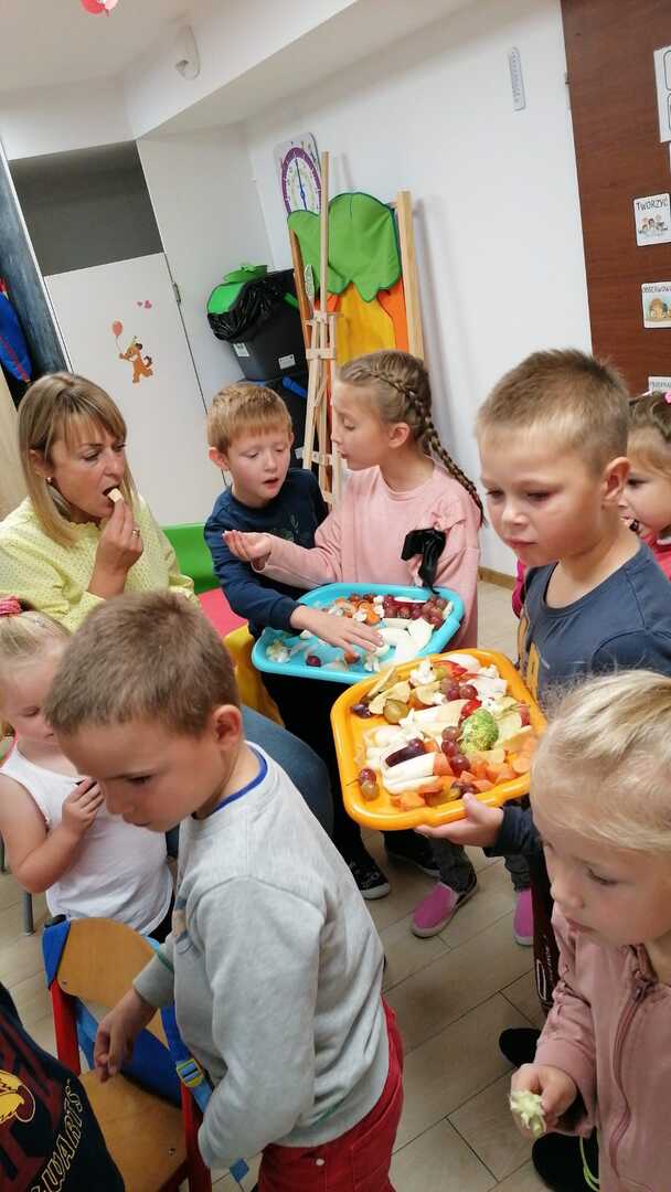 Podczas zabawy dzieci rozpoznawały owoce i warzywa poprzez dotyk, smak oraz węch. W klasie zrobiono piknik jesienny, a następnie zaniesiono dary do pań w sekretariacie i przedszkolu. Na koniec wykonano piękne figurki jesienne.
