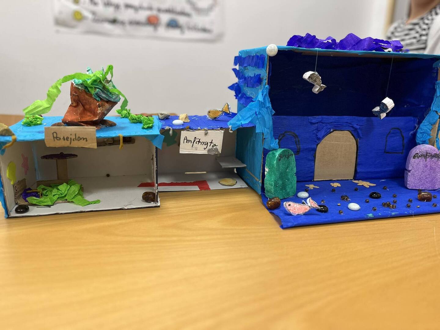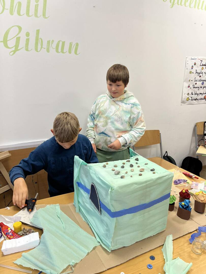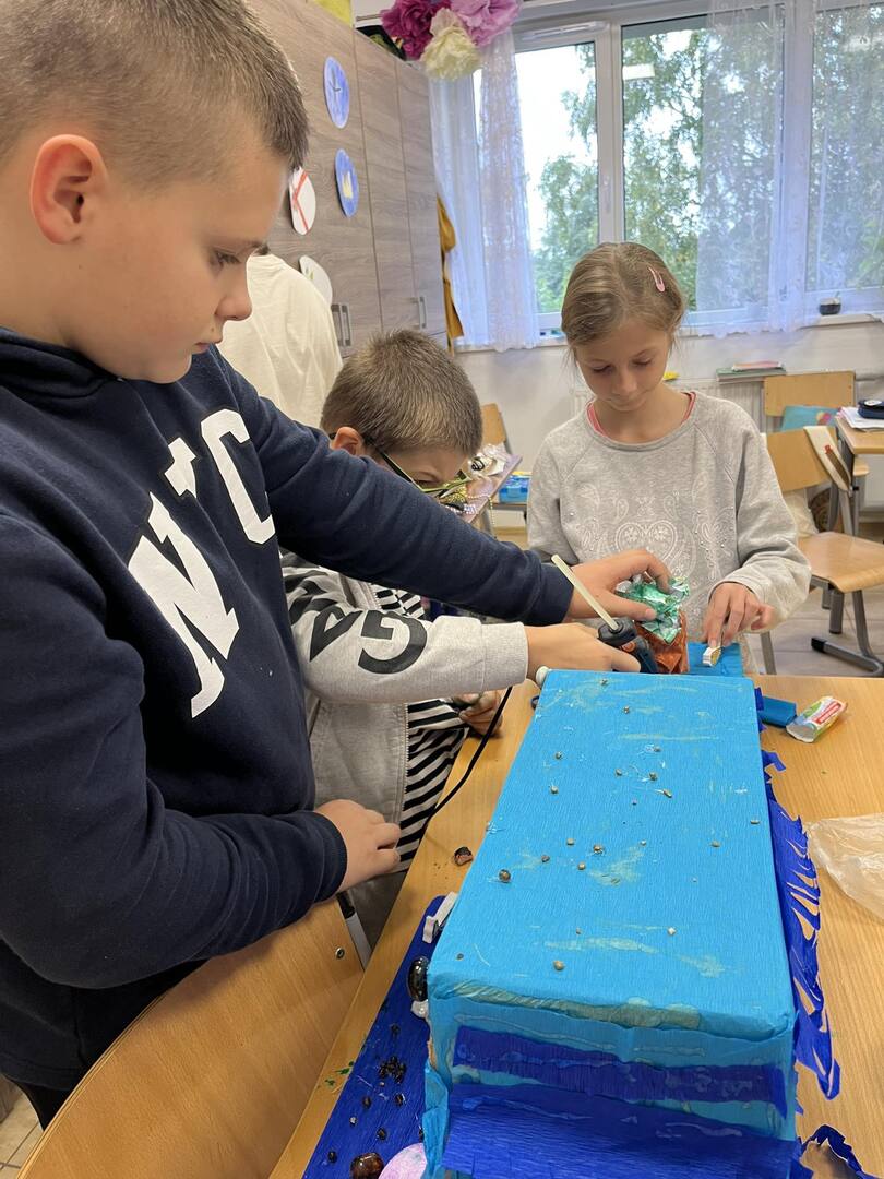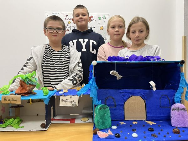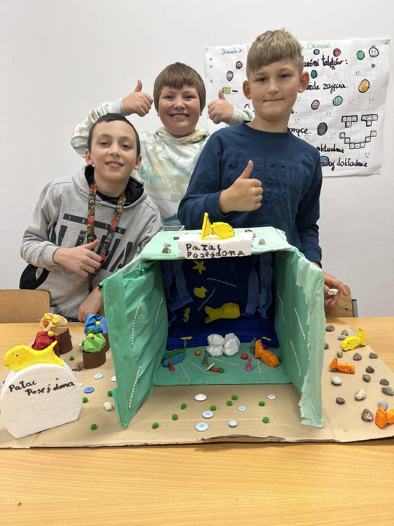 Dnia 20 października dzięki współpracy nauczycieli techniki i języka polskiego uczniowie klasy V z wielkim zaangażowaniem tworzyli swoje wizje pałacu Posejdona. Powstały wspaniałe, piękne prace, które sprawdziły umiejętności techniczno-plastyczne a także humanistyczne, bowiem uczniowie mieli za zadanie przekształcenie poznanego tekstu w makietę .