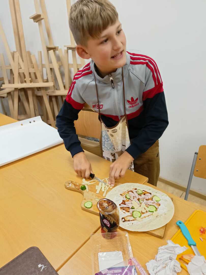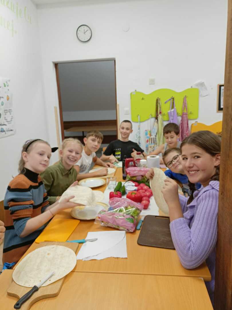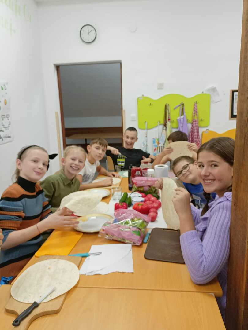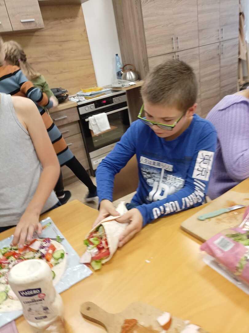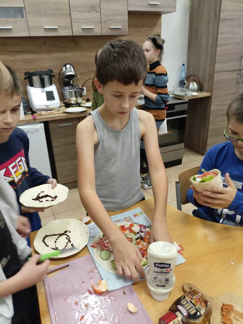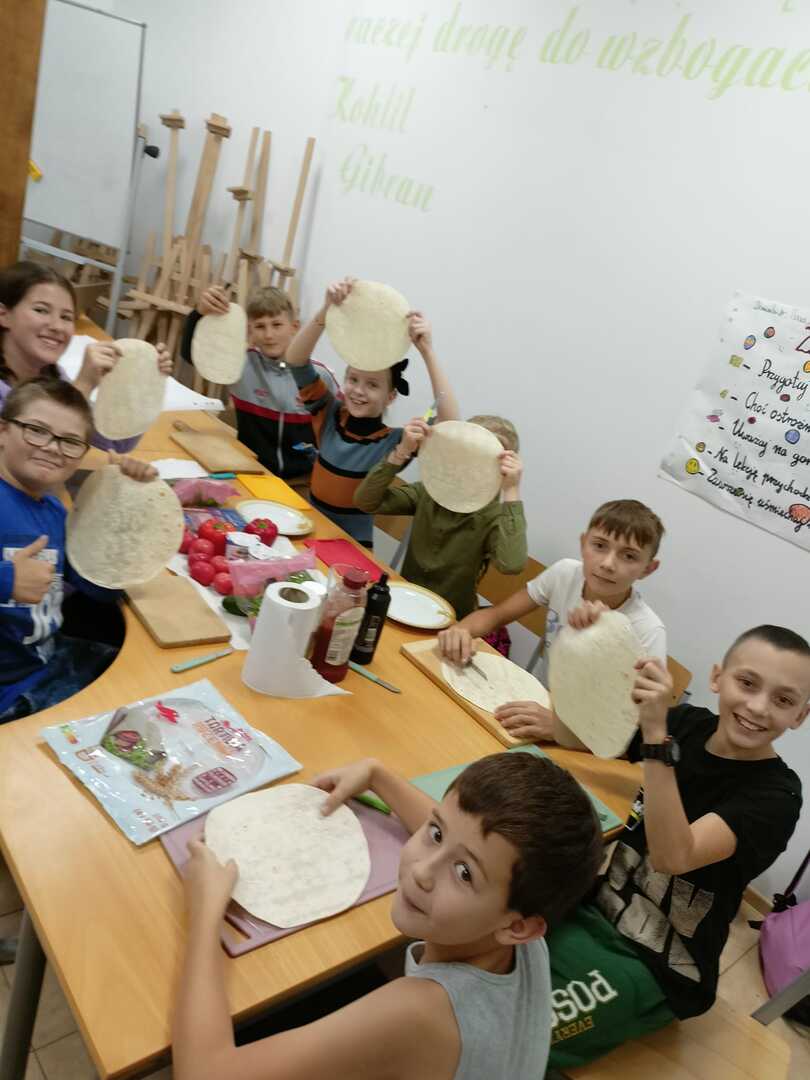 Na zajęciach rozwijających kreatywność uczniów doskonalimy swoje umiejętności kulinarne, ale również dbamy o zdrowe nawyki żywieniowe. Dziś przygotowywaliśmy tortille z dużą ilością warzyw, twarożkiem, kurczakiem, serem. Spożywaliśmy je zarówno na zimno jak i na ciepło.