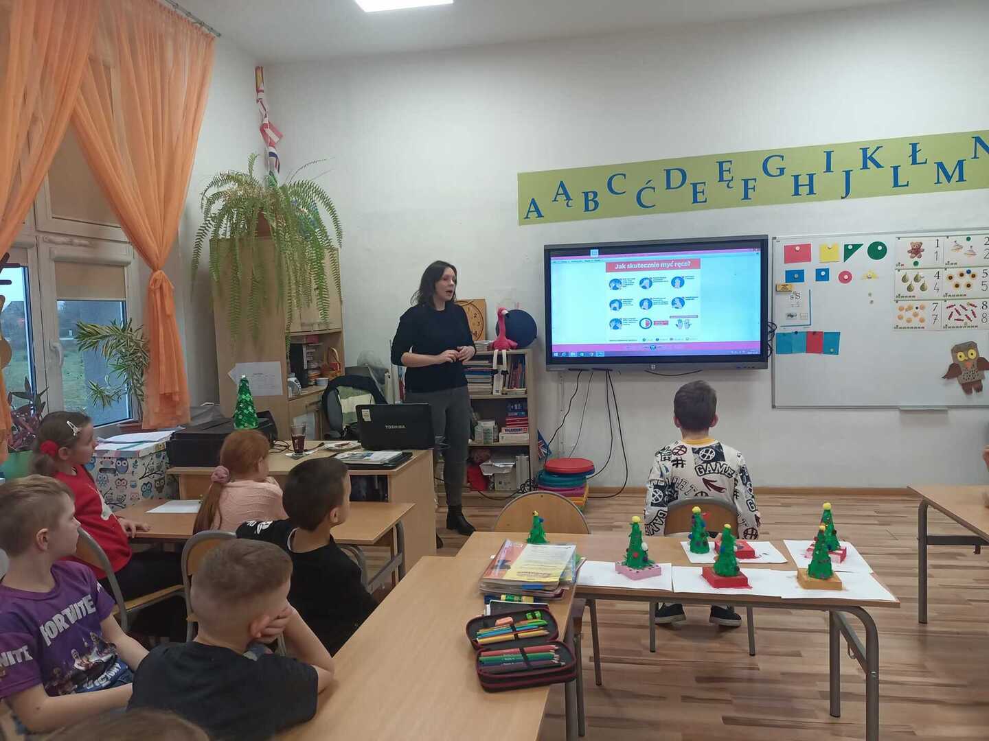 Ogromna wiedza, świetny kontakt z dziećmi i młodzieżą oraz serdeczność prowadzącej pozwolą nam podjąć właściwe decyzje w naszym młodym życiu. Dodatkowo korzystając z wiedzy Pani Magdaleny poruszone zostały aspekty chorób, grypy, profilaktyki oraz starannego dbania o higienę a szczególnie mycie dłoni. Najmłodsi pod czujnym okiem umyli starannie ręce zachowując zasady omówione przez Panią. Dziękujemy za spotkanie.