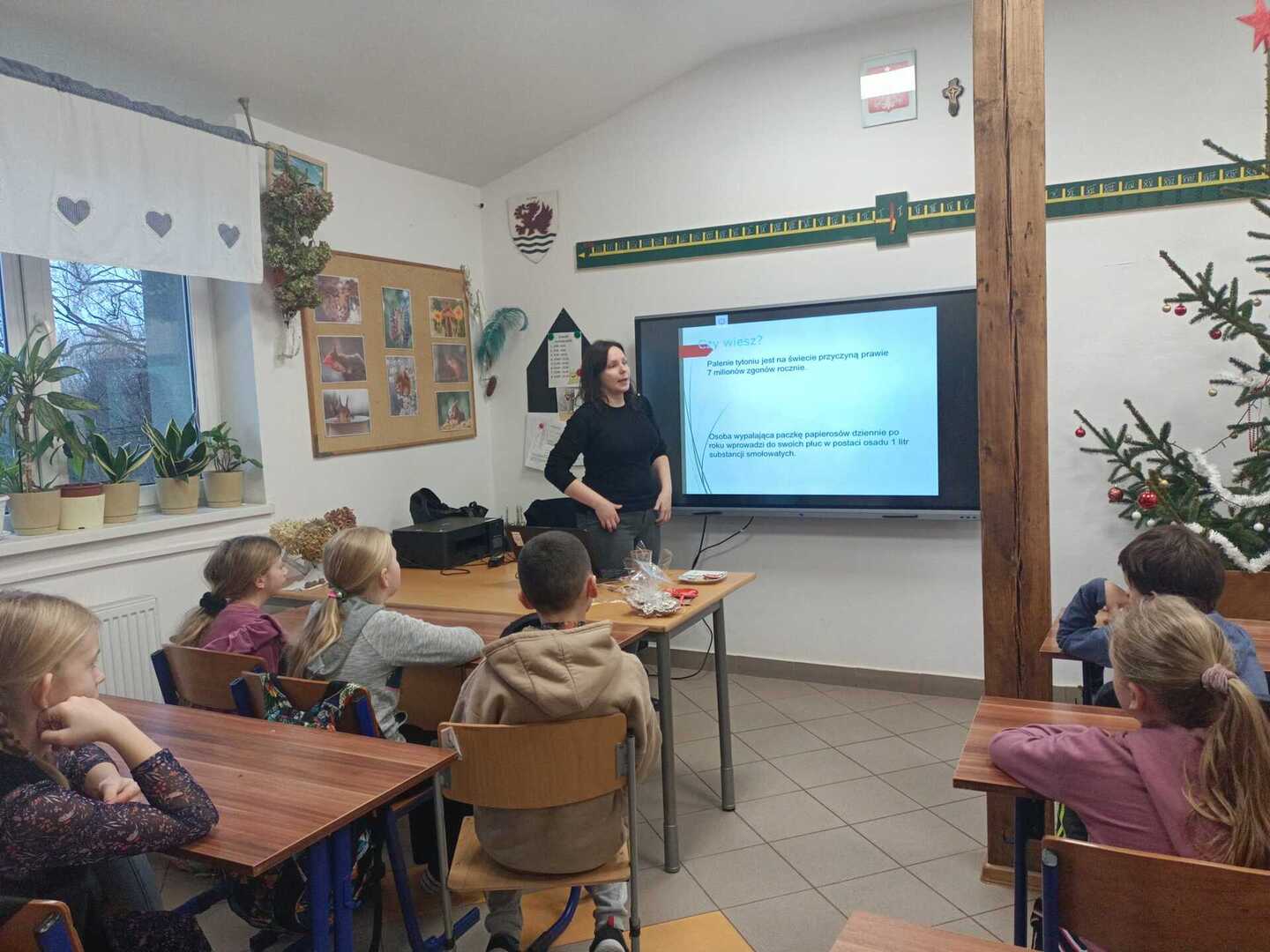 Dziś w naszej szkole gościliśmy wyjątkowego gościa Panią Magdalenę Kruk pracownika Powiatowa Stacja Sanitarno-Epidemiologiczna w Sławnie. Myślą przewodnią spotkania były papierosy, e-papierosy oraz szkodliwość ich działania na organizm. U progu ferii Pani Magda przypomniała nam o najważniejszych zasadach bezpieczeństwa podczas nich.