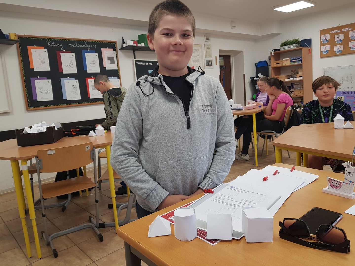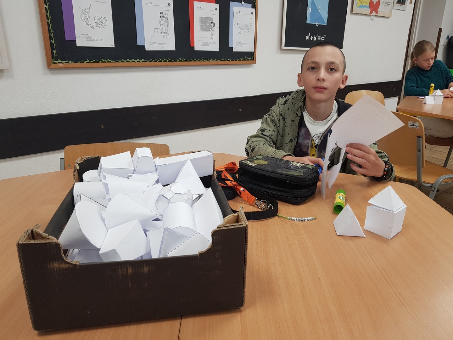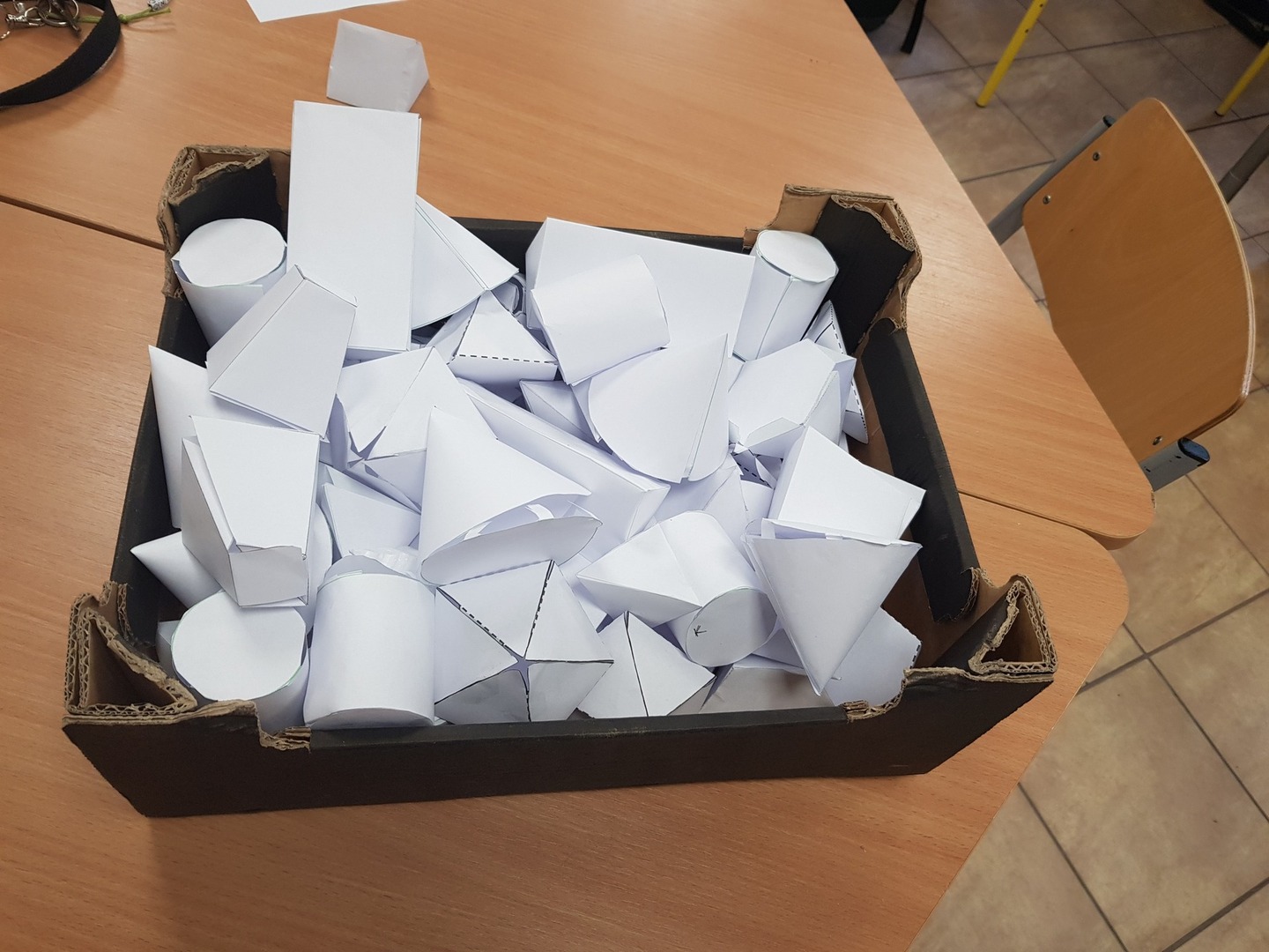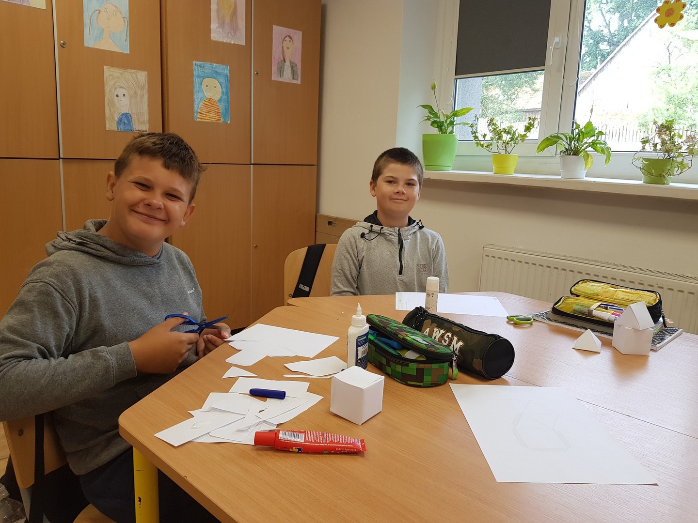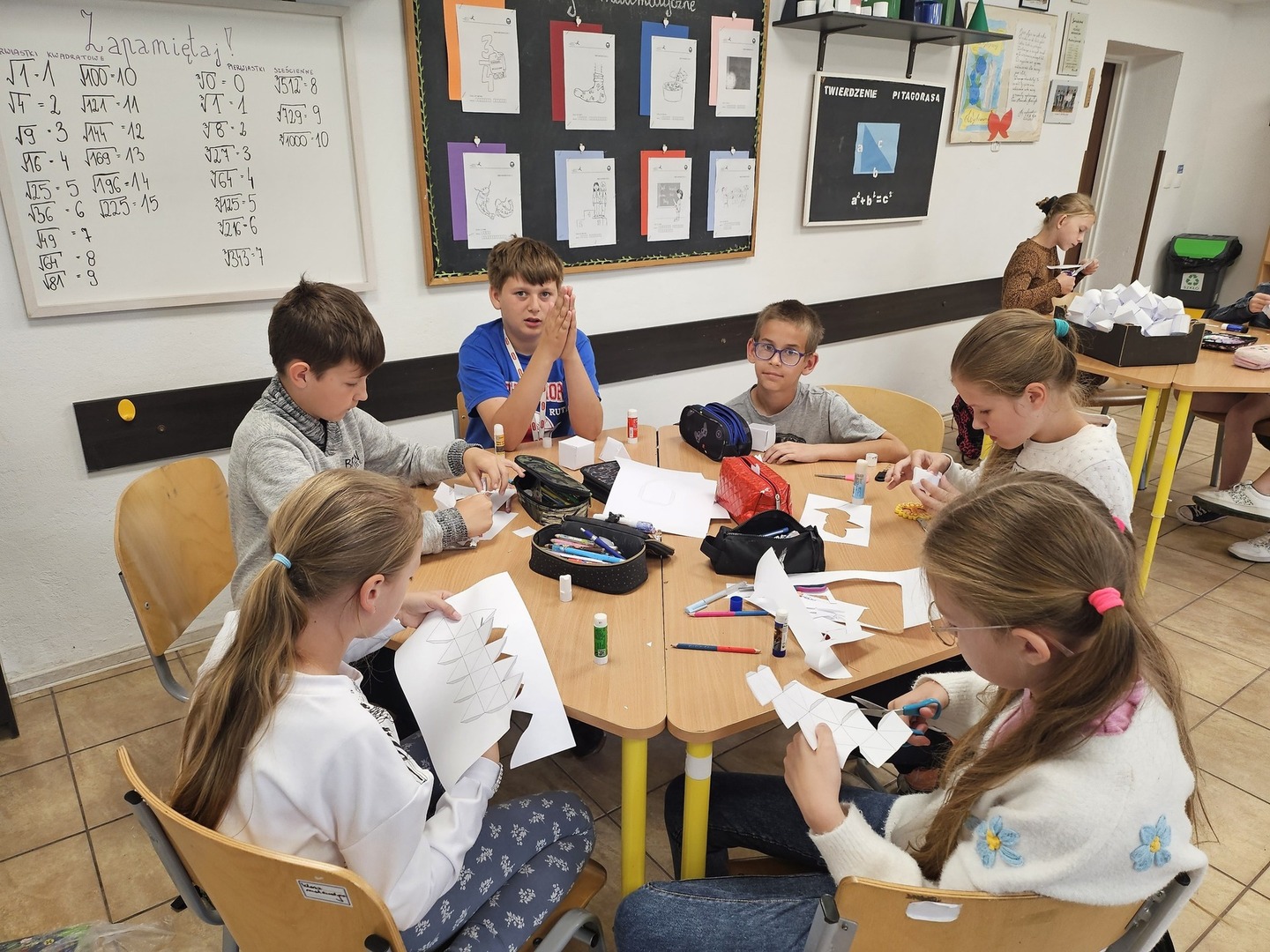 Na lekcji matematyki uczniowie samodzielnie sklejali siatki brył. Efekty można podziwiać w klasie matematycznej.