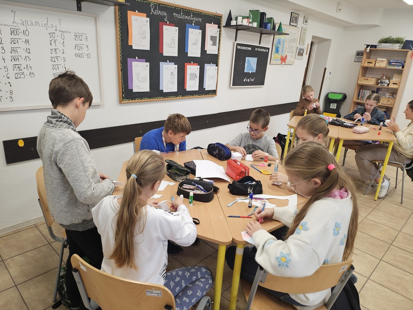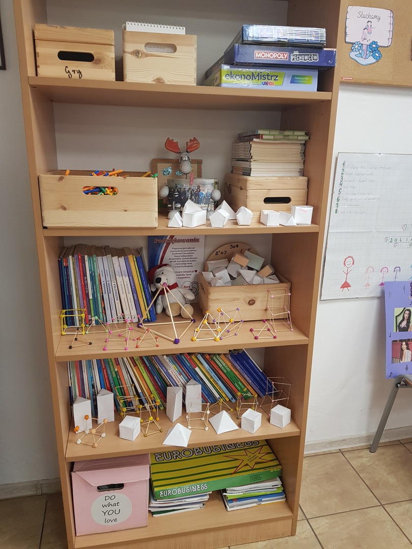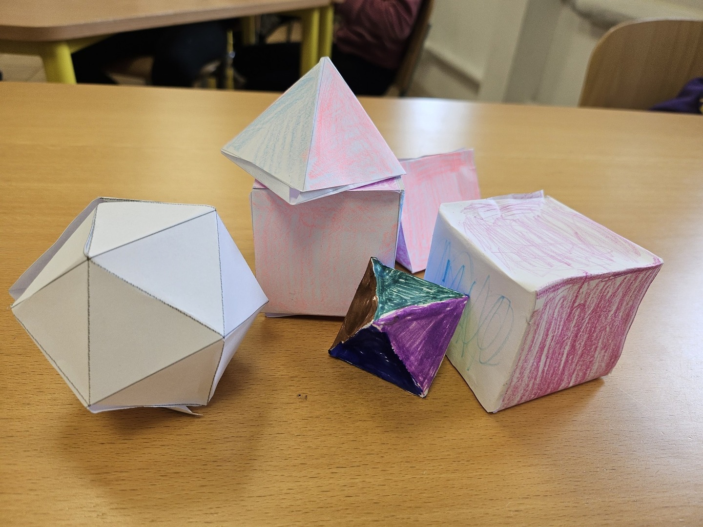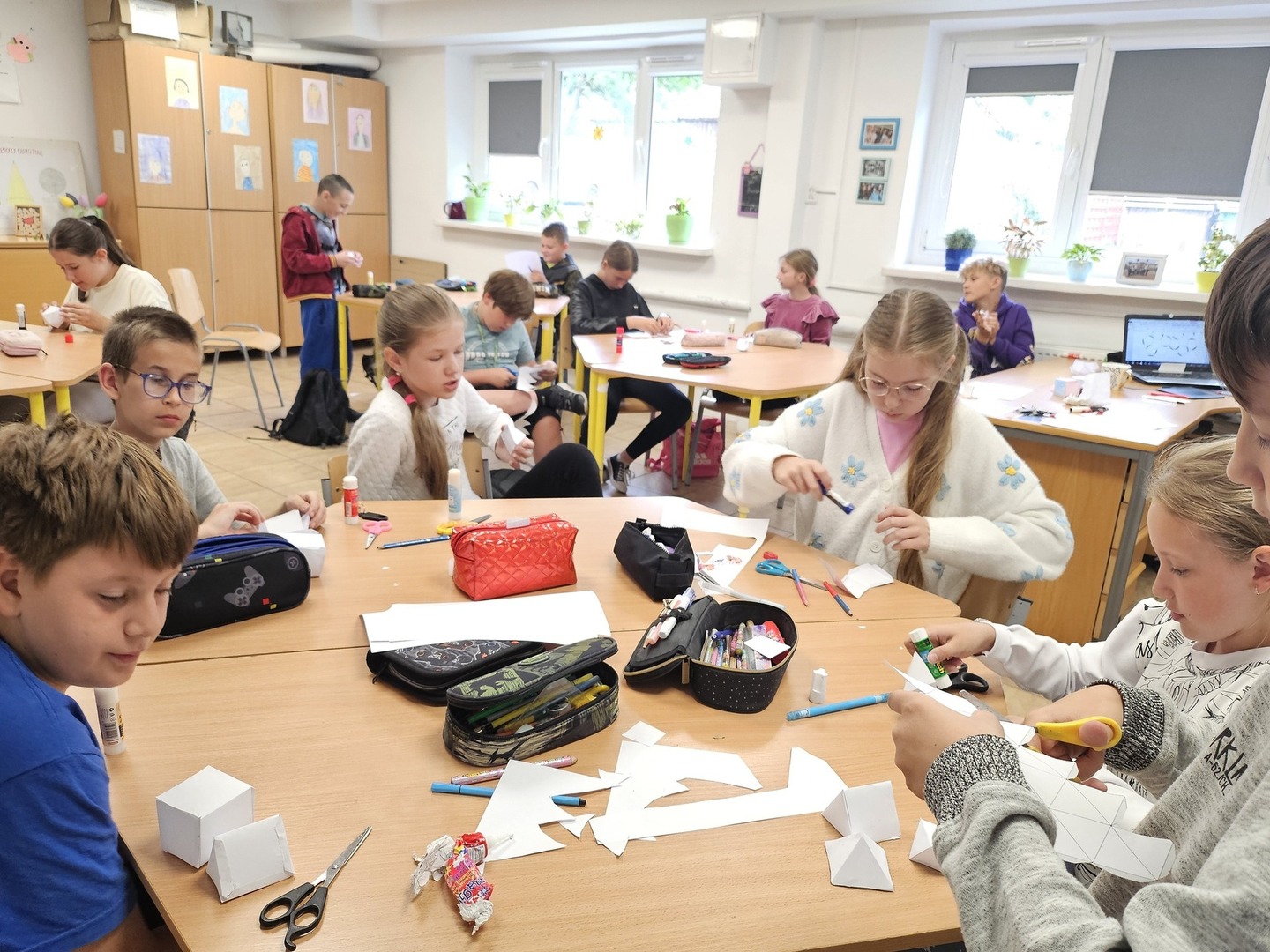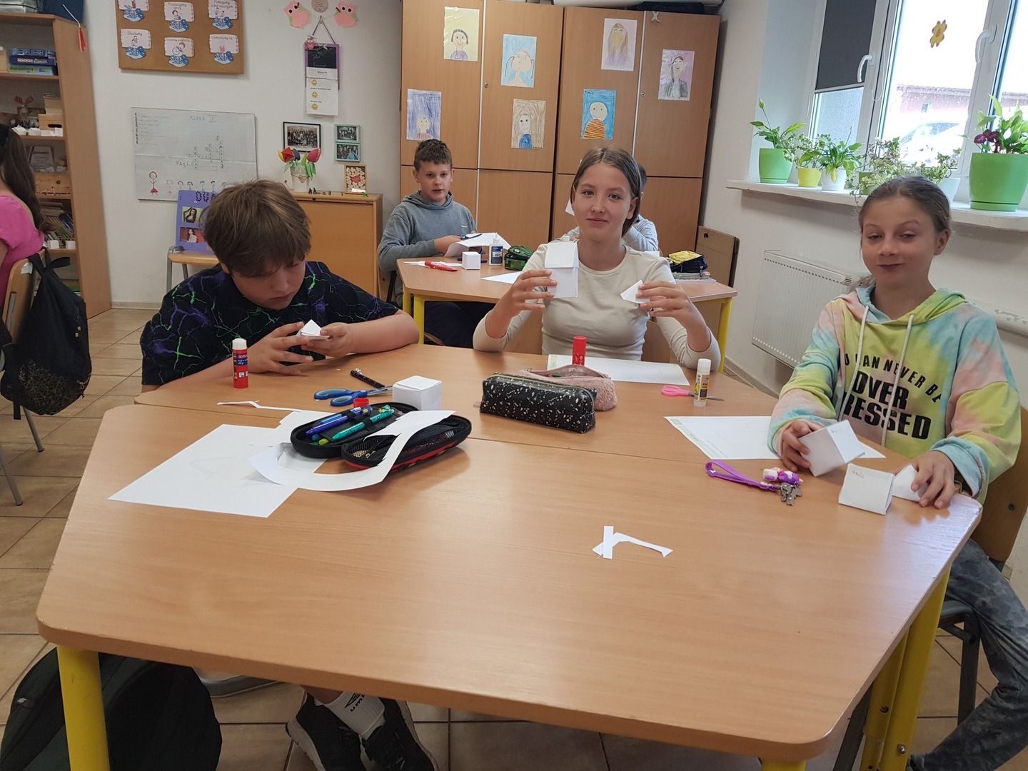 Na lekcji matematyki uczniowie samodzielnie sklejali siatki brył. Efekty można podziwiać w klasie matematycznej.