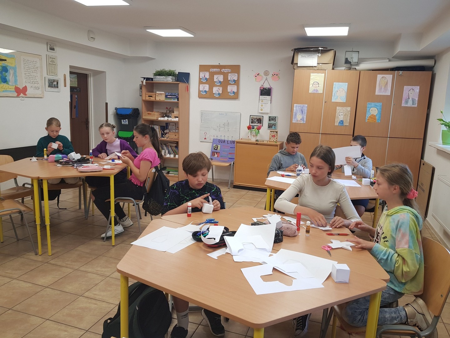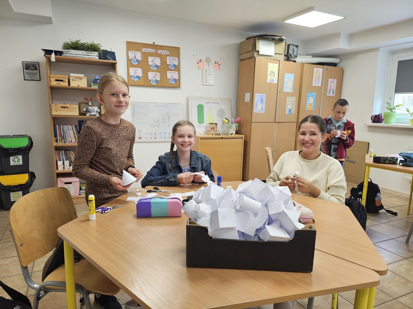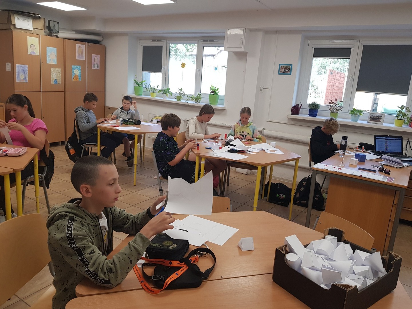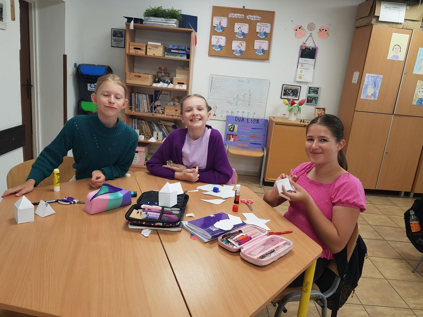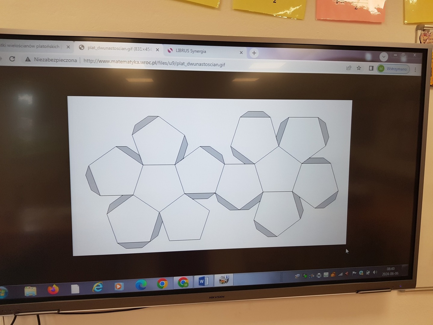 Na lekcji matematyki uczniowie samodzielnie sklejali siatki brył. Efekty można podziwiać w klasie matematycznej.