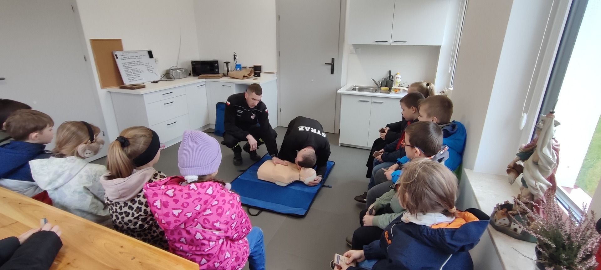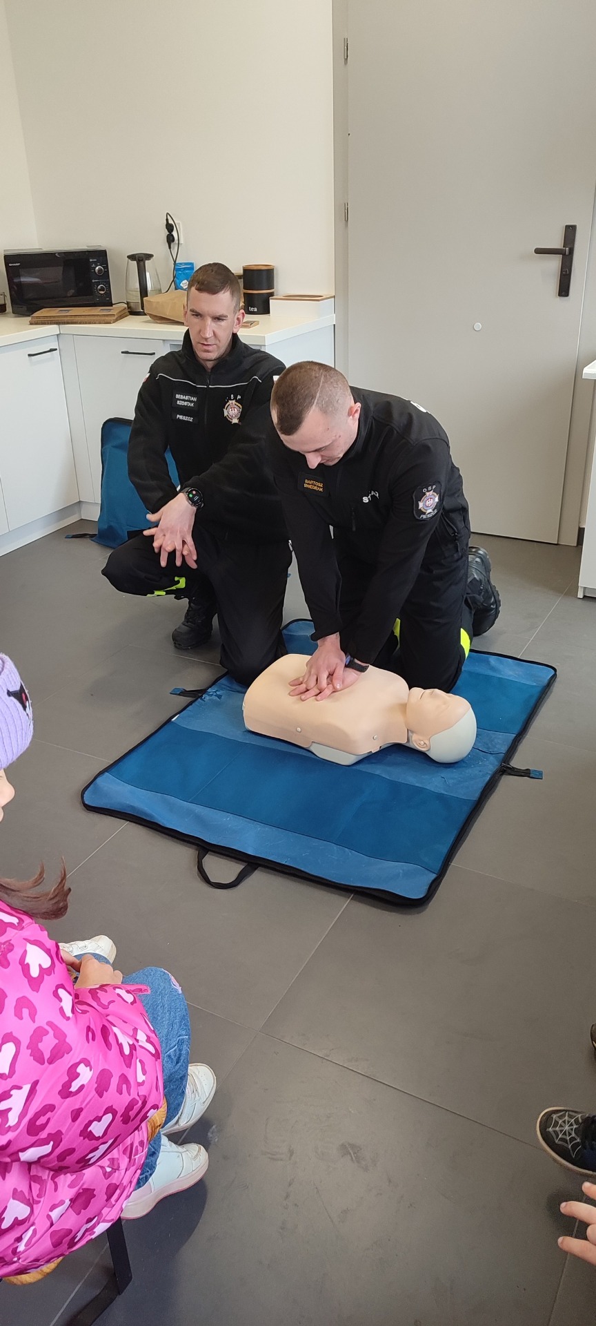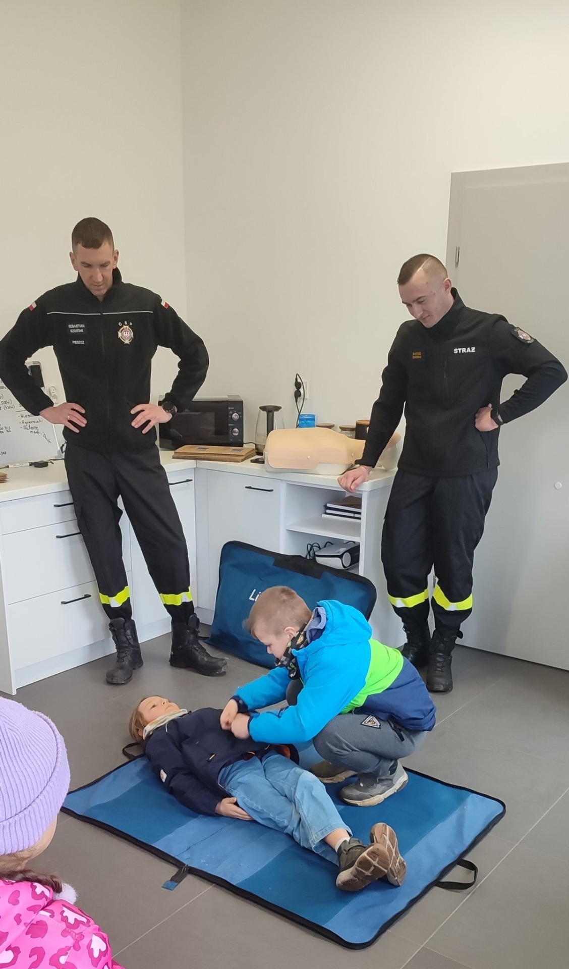Bartosz Swędrak . Uczniowie z wielkim zainteresowaniem wysłuchali opowieści o trudnej, odpowiedzialnej i niebezpiecznej pracy strażaka, utrwalili znajomość alarmowego numeru telefonu - 112. Nasze spotkane miało również na celu podsumowanie zajęć dotyczących dbania o zdrowie, więc druhowie pokazali nam także podstawy udzielania pierwszej pomocy przedmedycznej.