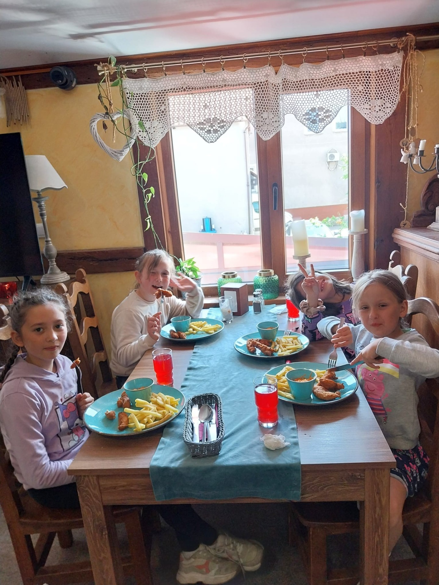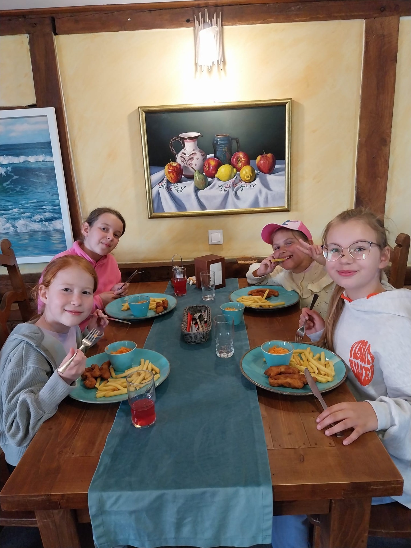 W czasie wyjazdu nie zabrakło również pysznego jedzenia – uczestnicy biwaku zjedli dwudaniowy obiad w restauracji „Jackowo”, a wieczorem, dzięki ogromnemu zaangażowaniu niezastąpionych rodziców, odbyło się ognisko z pieczeniem kiełbasek i wspólnymi zabawami.
